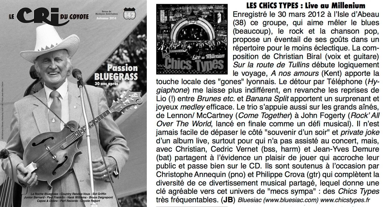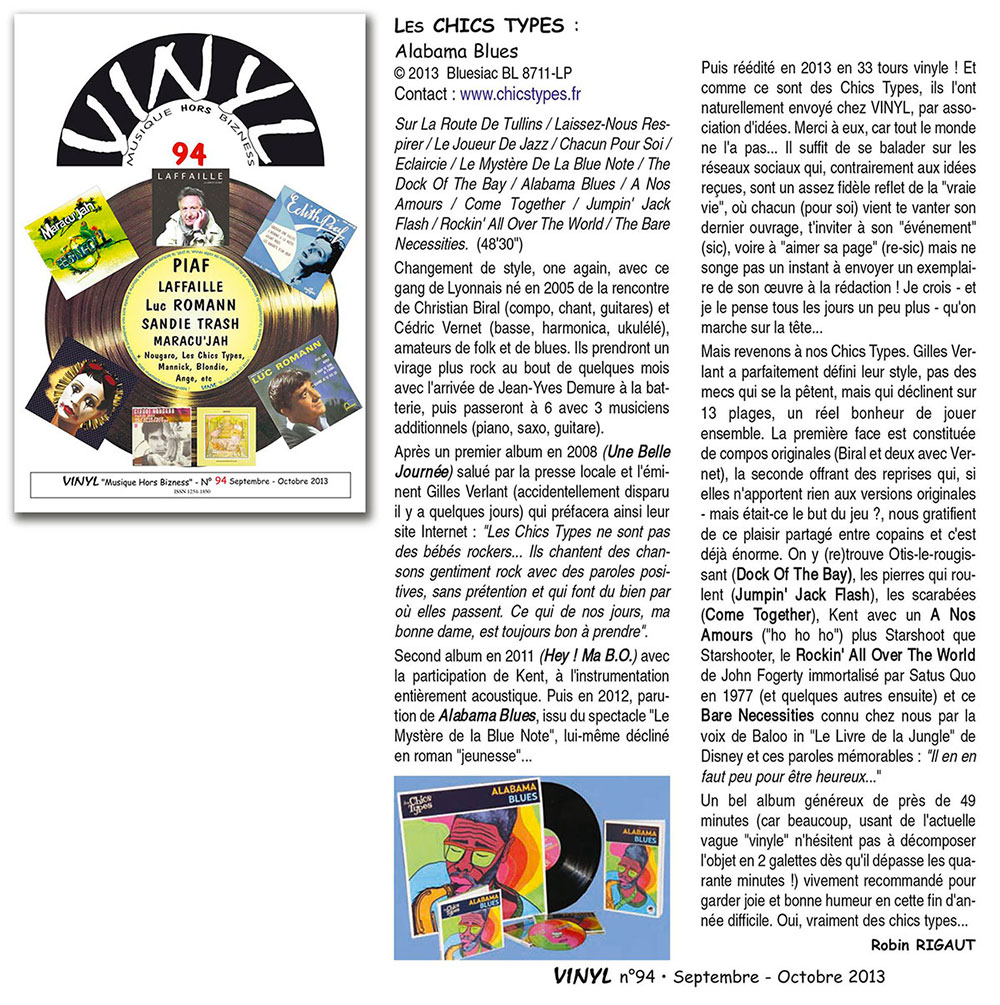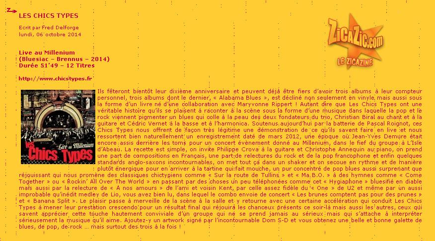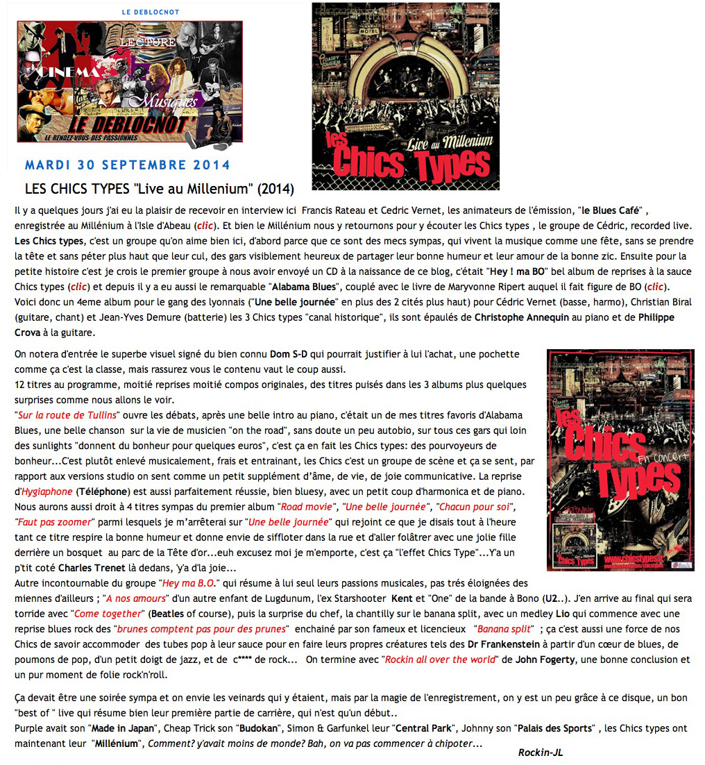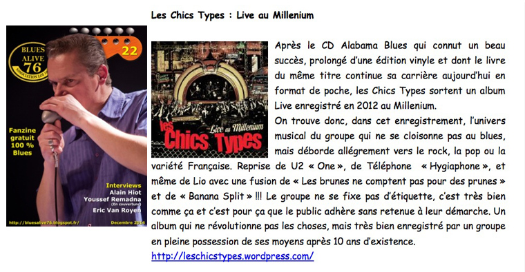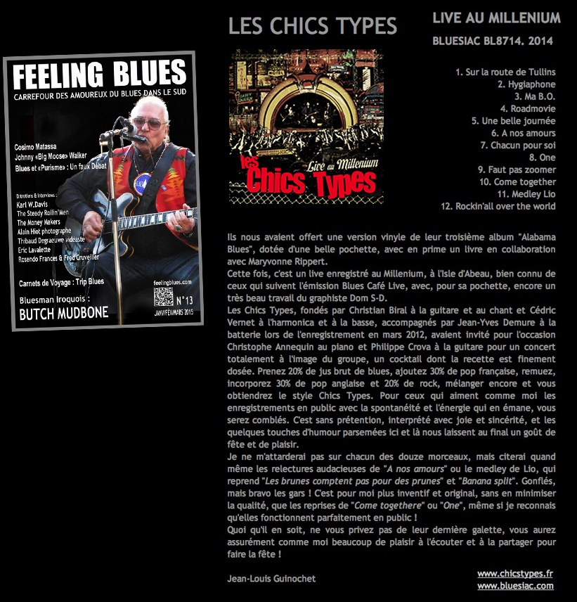Chez Bluesiac, on aime le blues, le blues sous toutes ses formes et ça tombe bien, Les Chics Types aussi ! On peut même dire qu'ils ont créé un nouveau style, la "Pop Blues" : un fin dosage de rock anglais, de blues américain et de pop française qui donne naissance à des petits bijoux de compositions originales en français et quelques reprises bien senties en anglais.