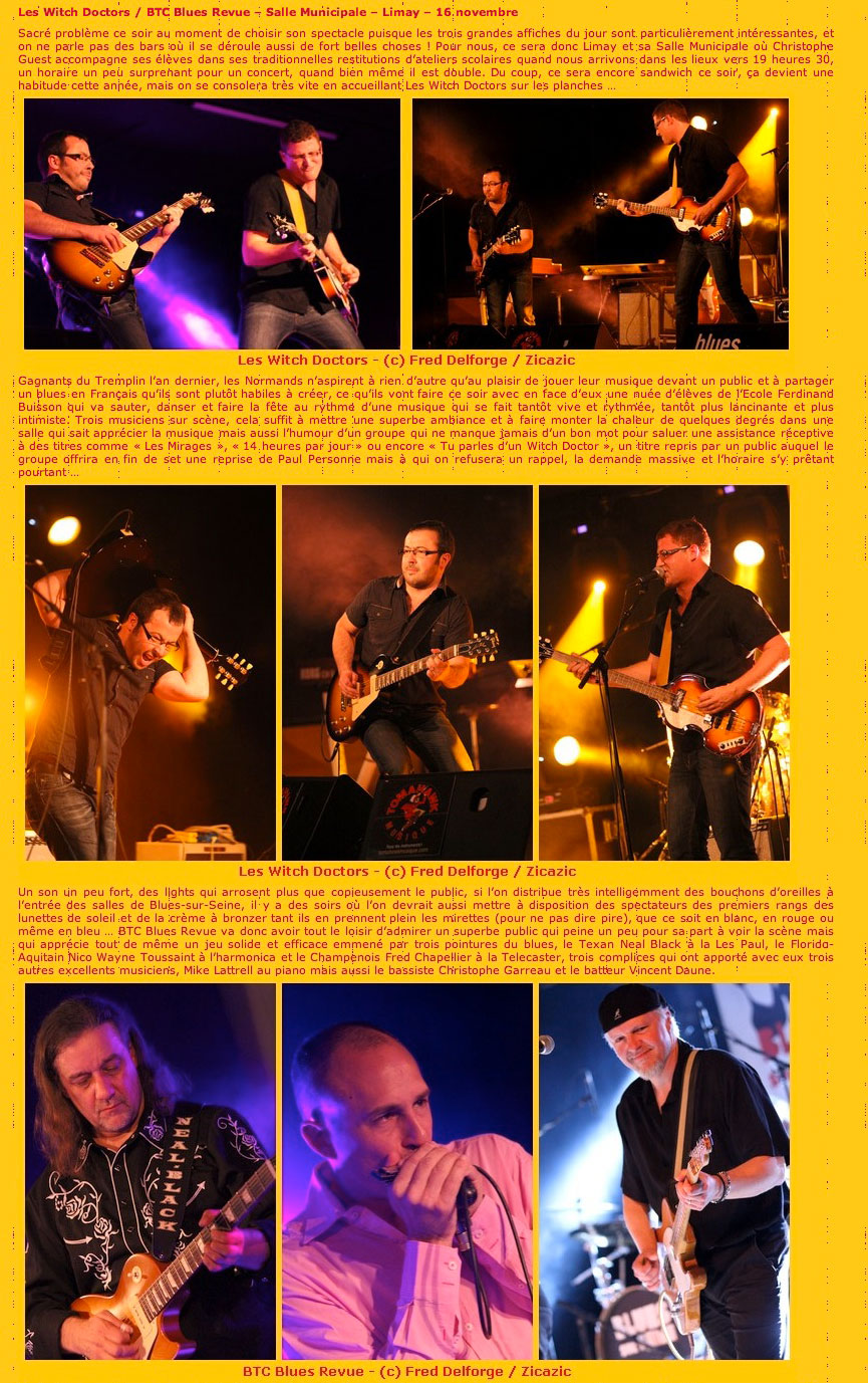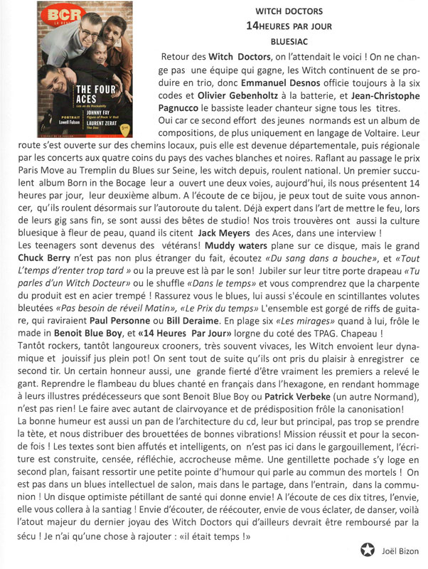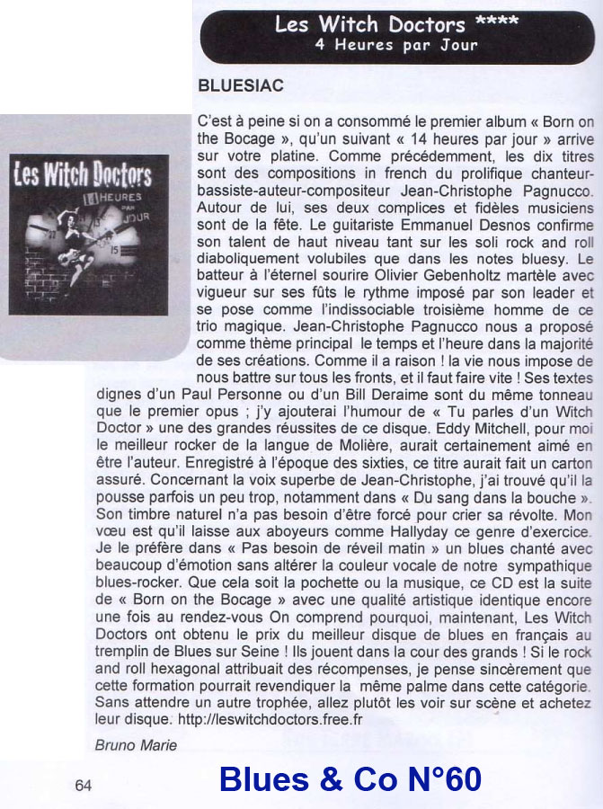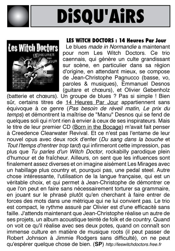 In order to do this, while still keeping in their fingers and hearts alike the pioneers' repertoire, Les Witch Doctors took to their heart to create and defend a French-speaking blues-rockíníroll, following the steps of the heroes of a maybe little represented musical style that nevertheless left a deep mark on them (Patrick Verbeke, Paul Personne, Benoit Blue Boy, Bill Deraime...).