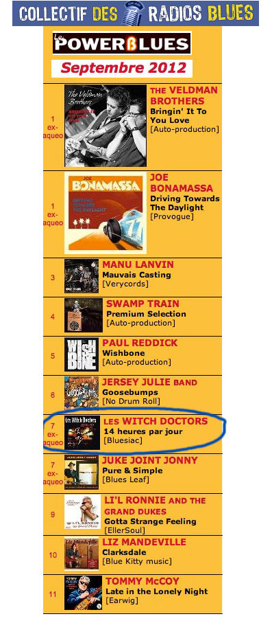 - Le CD classé 7e au Power Blues de septembre 2012 (Collectif des Radios Blues)