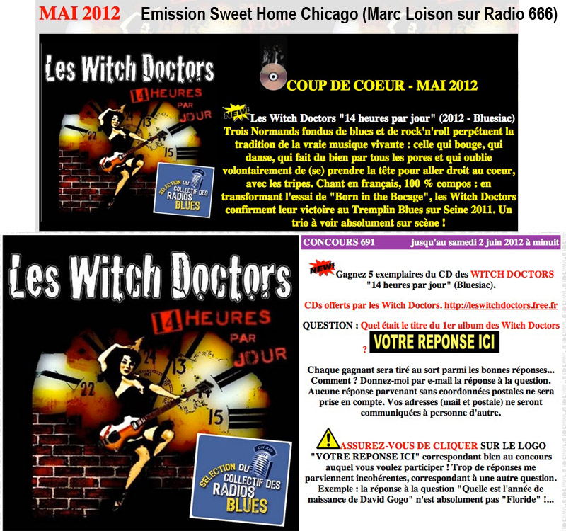 Le cd est Disque du mois de Mai 2012 sur Sweet Home Chicago, l'émission de Marc Loison sur Radio 666.