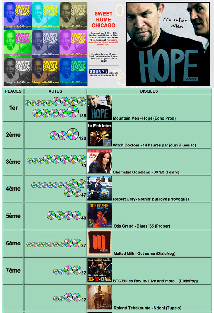 - 2e CD de l'année 2012 dans l'émission Sweet Home Chicago en janvier 2013