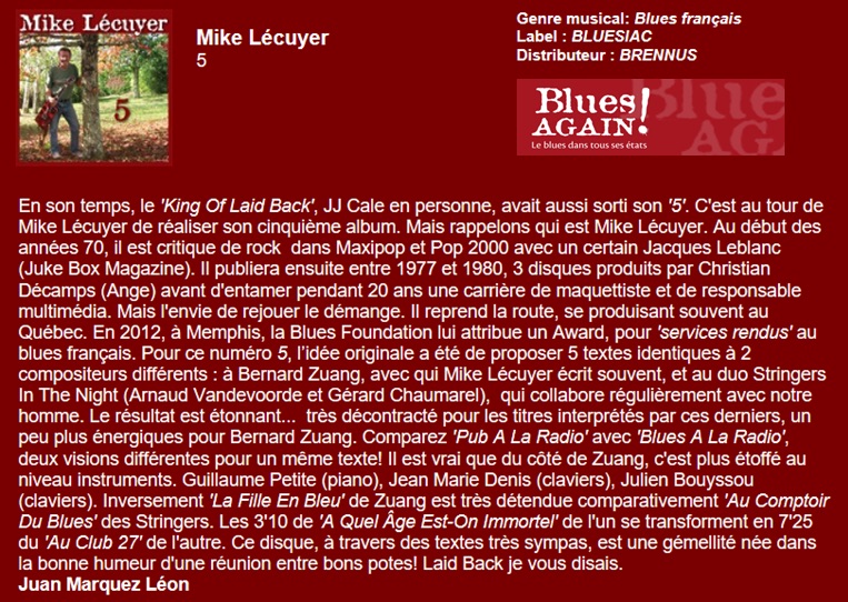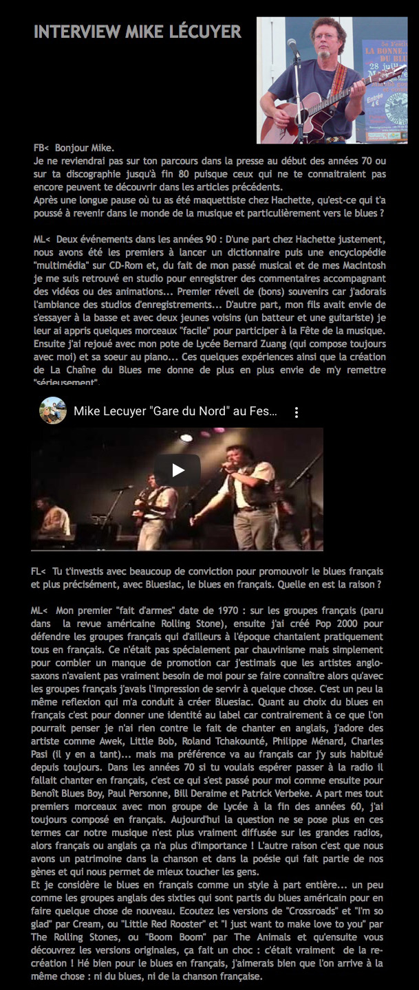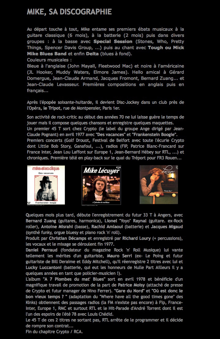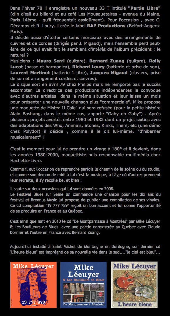 Après avoir été (parfois en même temps) Chanteur, Disc-Jockey, Banquier, Chauffeur-livreur, Editeur de presse, Rock-critic, Maquettiste, Chef de Projet Multimédia, webmaster, animateur de radio...Mike Lécuyer signe son retour sur la scène internationale du microcosme du blues en fr en publiant, après de multiples embûches "administratives", la compilation de ses 3 disques vinyles parus en 1977, 1978 et 1979.