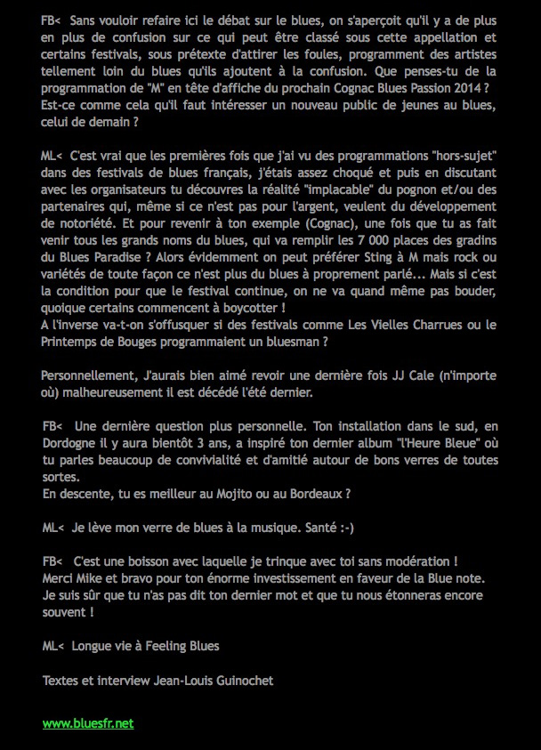 .:: As a journalist said: "Whatever the venue, a small bar in the Montparnasse (Paris) or a big Festival in Montreal (Quebec), Mike always manages to involve the audience, who sing all together his blues choruses in French".