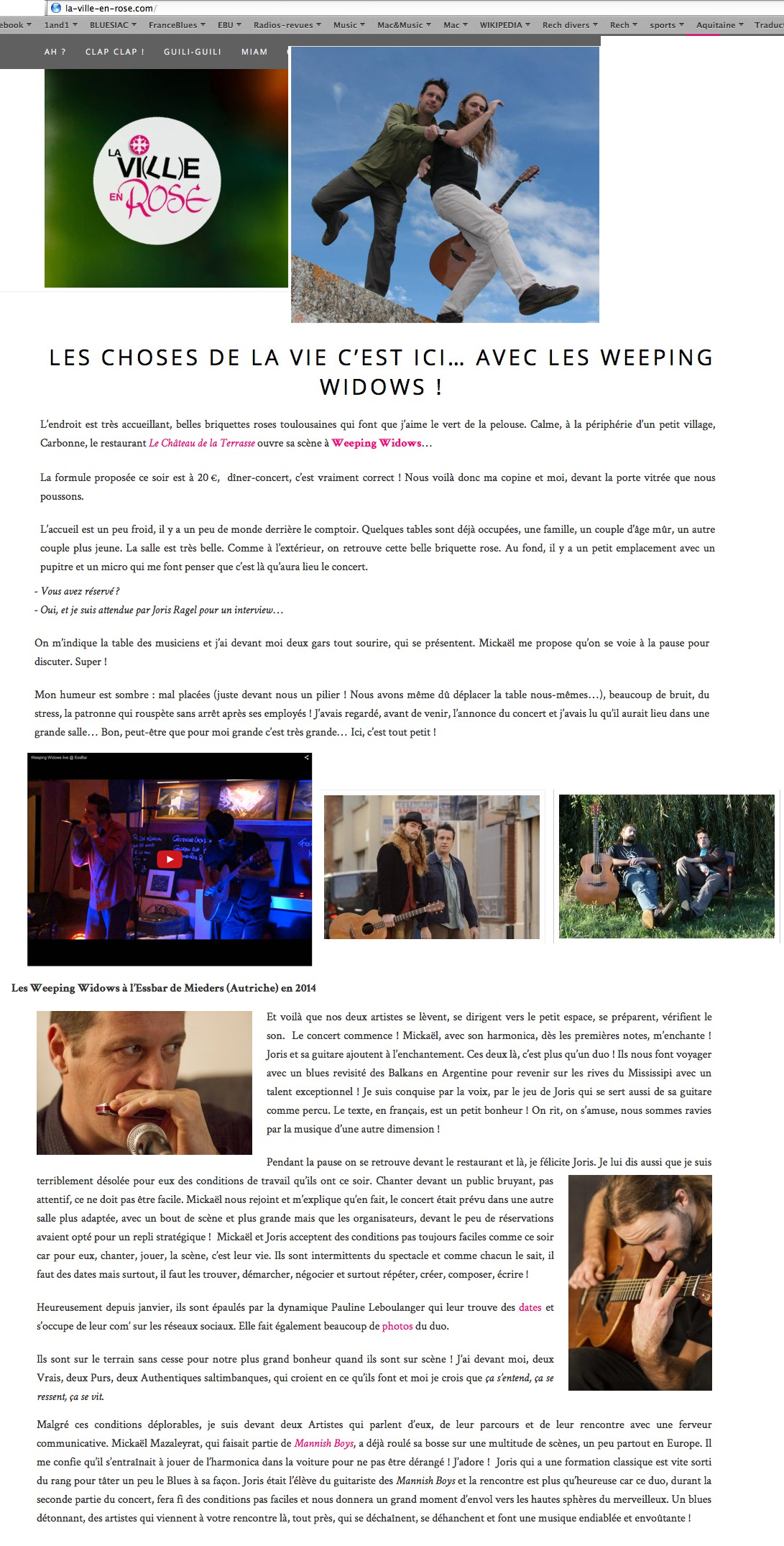 Rares sont les groupes capables de renouveler un genre tel que le blues avec une formule aussi classique. C'est pourtant ce que réussit Weeping Widows dans chacun de ses morceaux, en mariant la tradition à la modernité, le vieux Blues de Delta et celui plus actuel de Monde, nous faisant voyager jusqu'en Afrique, dans les Balkans ou l'Argentine sans jamais perdre son origine: les rives du Mississippi. Pour autant le groupe ne renie pas ses origines, et c'est en Français que Mickael Mazaleyrat, harmoniciste hors-pair, s'exprime, épaulé par un jeune guitariste de talent. Un groupe explosif qui prend toute sa dimension sur scène."