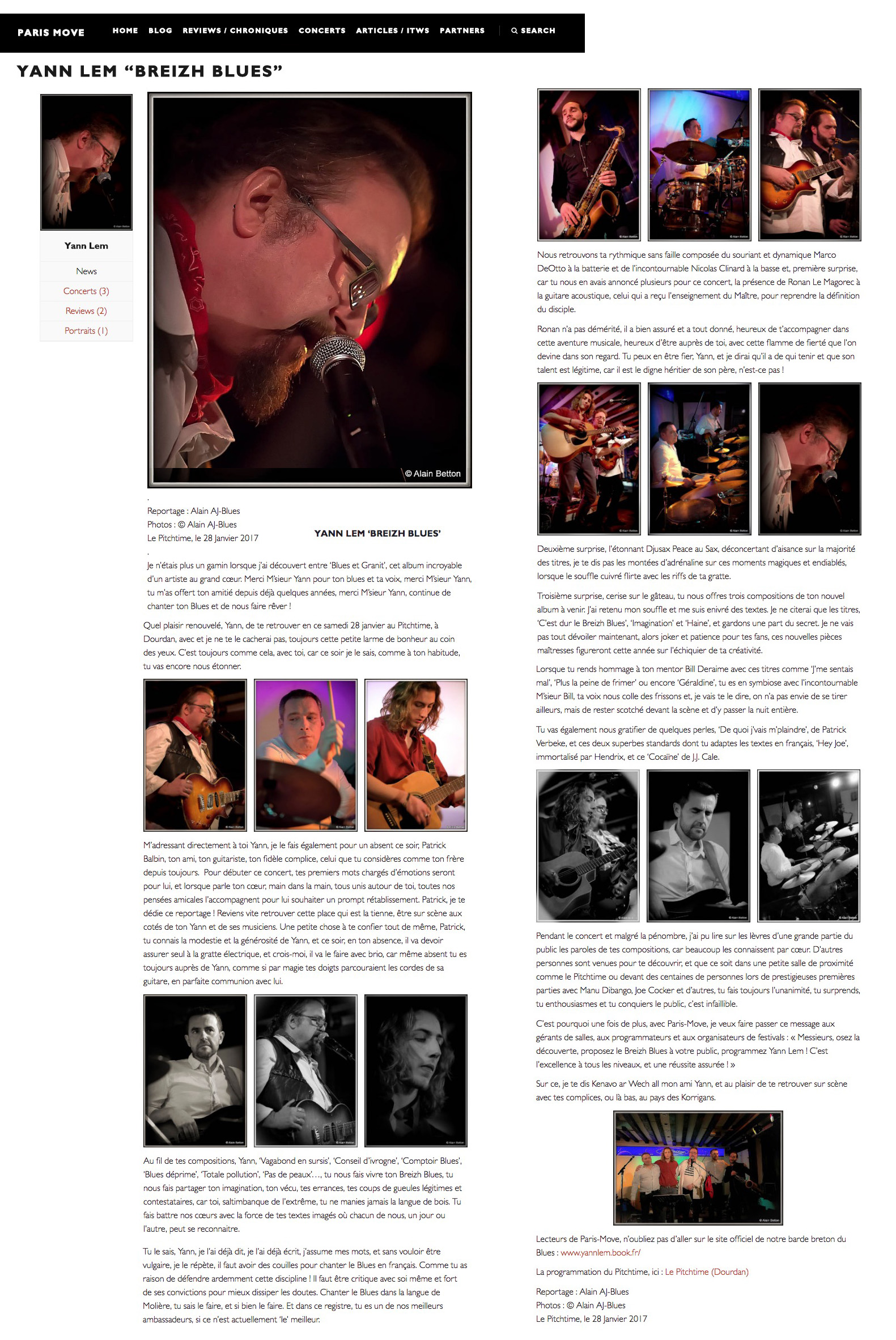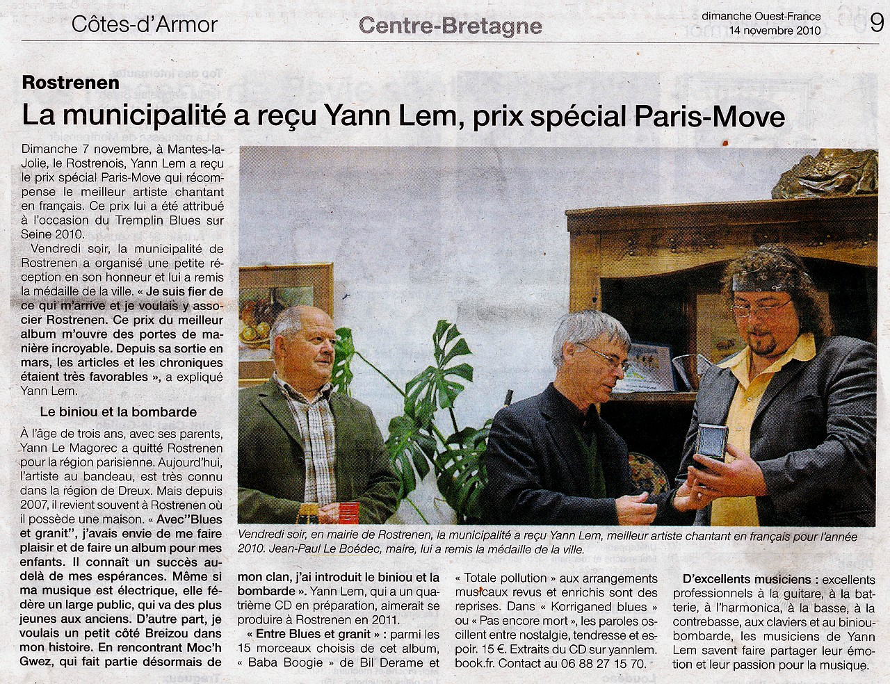Yann Lem remporte le prix "BOURSE PARIS-MOVE Blues en français" (nov. 2010).