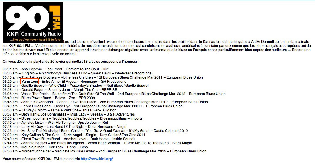 - Un animateur radio anglais a programmé quelques artistes francais dans plusieurs émissions "Raven 'n' Blues" par Dave Raven (Commentaires, en anglais, sur Mike Lécuyer, Yann Lem etc.