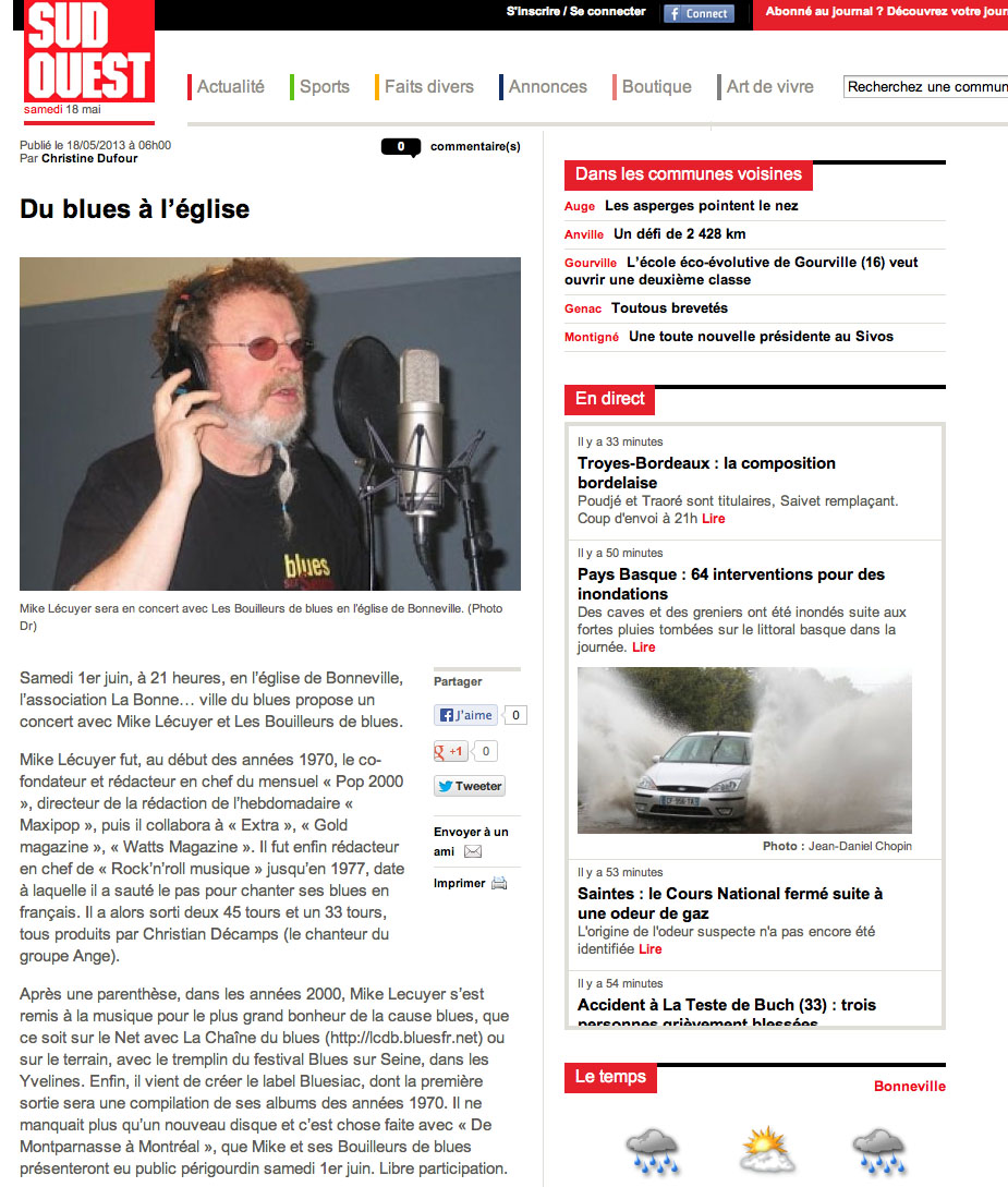 • MIKE LECUYER : 14/07 à 12 h, Restaurant Harveys (Montacret, 24) - 27/7 Festval La Bonneville du Blues (Saint Vivien,24) avec les enfants du centre aéré de Bonneville.