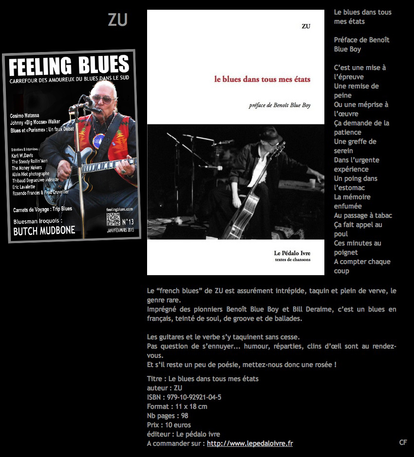 • ZU : parution d'un recueil de textes de chansons blues intitulé "le blues dans tous mes états" chez Le Pédalo Ivre (Lyon). Préface de Benoît Blue Boy. 10 € (+ 3 € de port) - 47 textes - 98 pages - format poche.