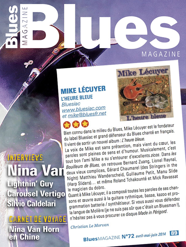 • MIKE LECUYER : chronique du cd "L'heure bleure" dans Plouc Magazine (Ange).